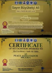 Nijerya Devleti’nin üst düzey kurulları tarafından yapılan değerlendirmede, 36 eyalet delegesi, Nijerya Prensi ve ilgili resmi kurulların ortak oylamasıyla “Barış için Birleşmiş Milletler entegreli Küresel Büyükelçilik” unvanı Ali Yıldız’a oy birliğiyle verildi. Nijerya’da yalnızca toplumda güven oluşturan, kültürel diplomasi yürüten ve barışa katkı sağlayan isimlere takdim edilen bu unvan, ülke tarihinde nadir bir paye olarak kabul ediliyor.
